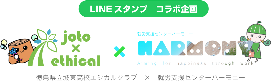 就労支援センターハーモニーでは、徳島県立城東高等学校エシカルクラブの皆さんと連携し、エシカル消費を身近に感じてもらう取り組みとして、LINEスタンプの制作・販売を行っています。